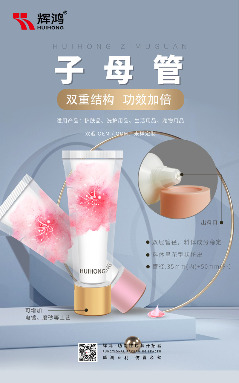 【工藝設計特點】:內/外管分裝不同料體,蓋子設計兩種料體出:使用時出料口混合,可擠出一朵花型;雙管齊下,功效倍增,需先鎖蓋,尾部灌裝
